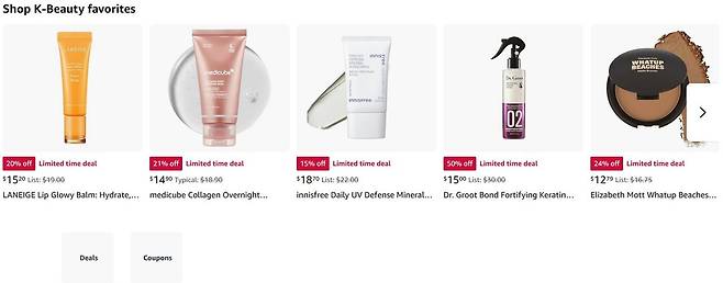 미국 최대 전자상거래업체인 아마존 온라인 쇼핑몰에서는 현재 '여름 뷰티 이벤트'로 기초·색조 화장품 등을 할인 판매 중인 가운데, 세부 카테고리로 'K-뷰티 인기 제품'(K-Beauty favorites)을 따로 분류해 보여주고 있다.