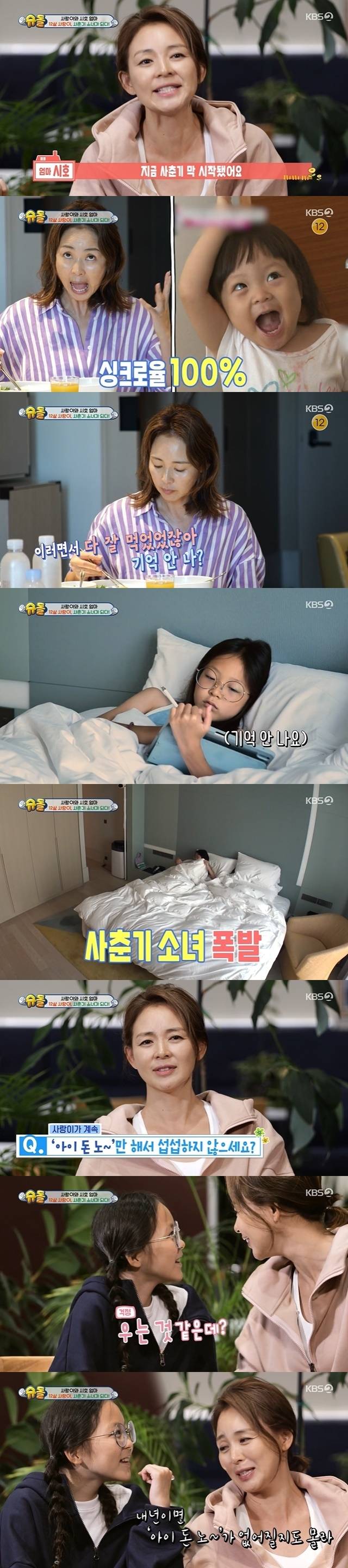 야노 시호는 "지금 사춘기가 막 시작됐다. 친구한테 중학생 때부터 진짜 힘들어진다는 얘기를 들었는데 이제 진짜 사춘기의 시작인가를 느끼고 있다"고 토로, 추사랑에게 직접적으로 "사춘기에 들어서니까 어떠냐"고 물었다. 사춘기 뜻이 뭔지도 잘 모르는 추사랑은 "엄마 귀찮아 하는 거, 아빠 엄마 짜증 나, 내 페이스대로 하는 거 이런 느낌"이라고 설명하자 고개를 끄덕이며 "약간 그런 느낌"이라고 인정했다.