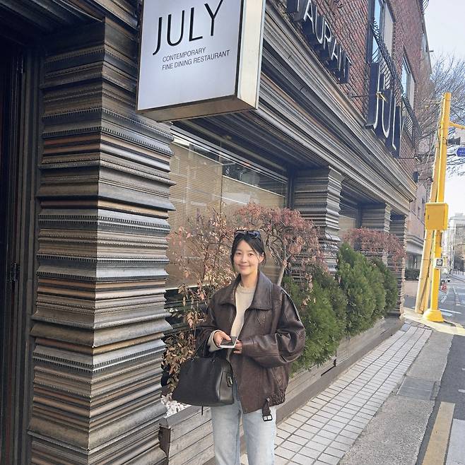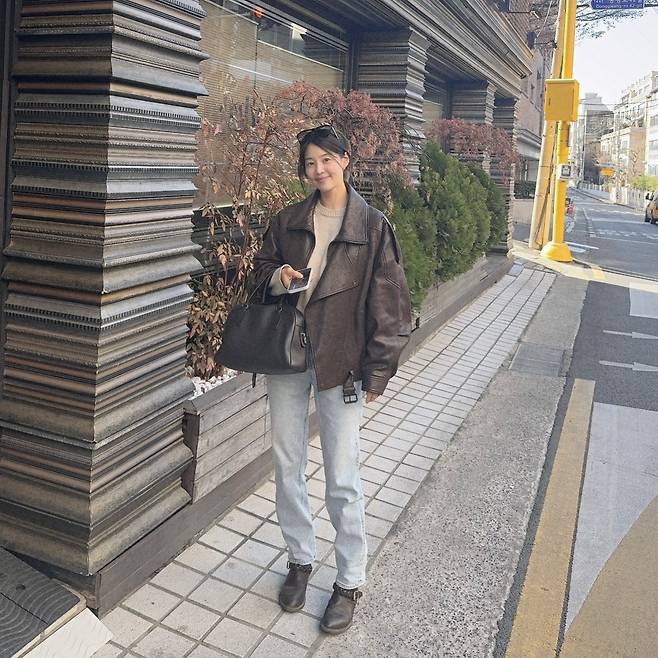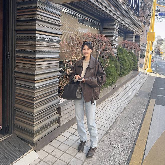여기에 매치한 연한 색상의 일자핏 데님은 전체적인 코디에 밝은 리듬감을 불어넣으며, 발끝을 감싸는 짙은 갈색 부츠는 상의와 색감을 맞춘 듯 조화롭게 어우러져 그녀만의 감각적인 패션 센스를 완성하는 영리한 포인트가 됩니다.