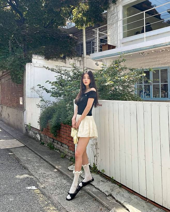 이 룩은 여름철 데이트룩이나 감성 골목 나들이에 딱 맞는 스타일이다. 따라 하고 싶다면 핵심은 ‘심플한 상의 + 러블리한 디테일의 양말과 슈즈’ 조합이다. 프릴 양말이 다소 과하다면 기본 골지 양말로, 도트탑이 부담스럽다면 플레인한 오프숄더로 대체해도 좋다.