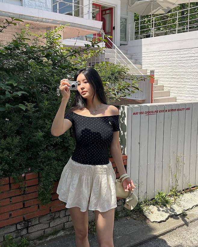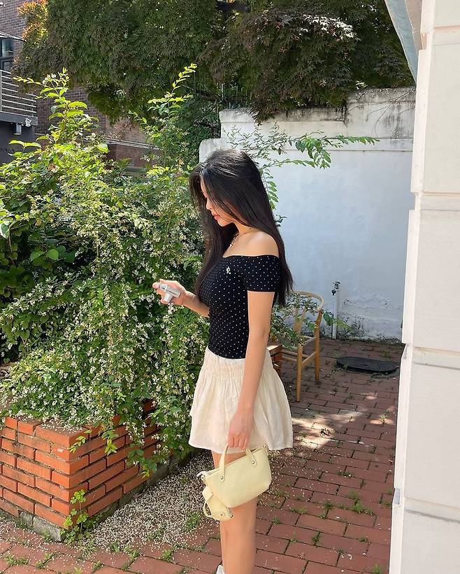 심지영이 선택한 상의는 블랙 도트 패턴이 들어간 오프숄더 탑이다. 어깨선을 드러내는 디자인은 여름철 시원한 무드를 주는 동시에, 쇄골 라인을 강조해 여성스러움을 극대화한다. 은은한 도트 포인트는 클래식하면서도 귀여운 감성을 더한다.