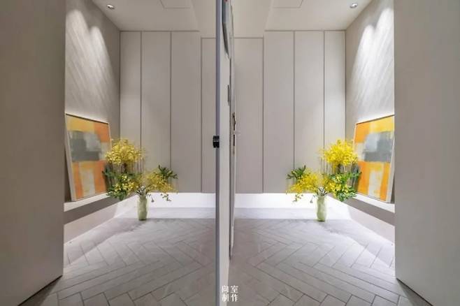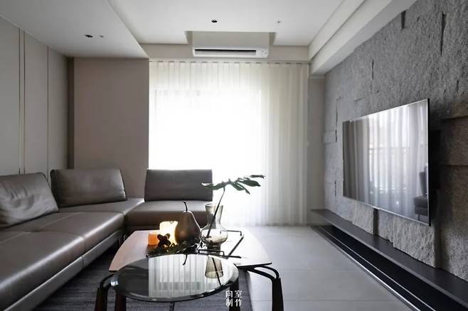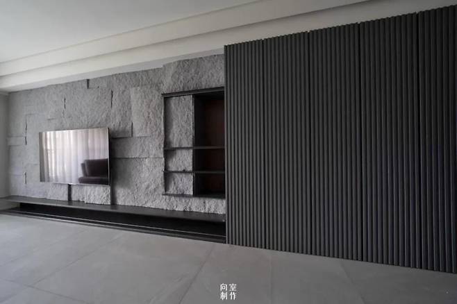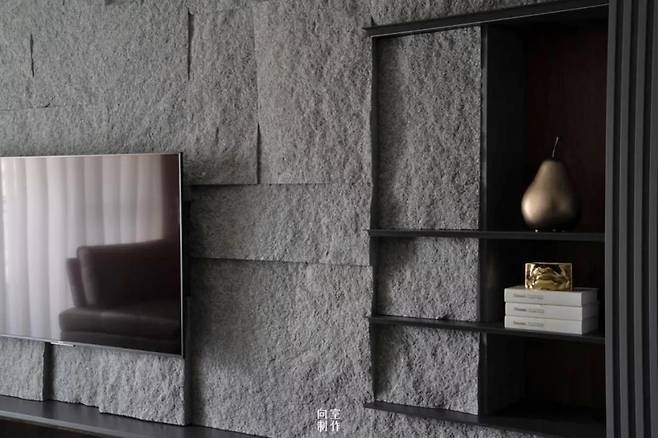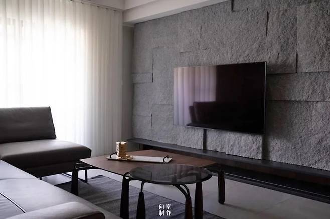 벽면을 장식한 고래빛 돌판은 산의 절벽을 연상시키는 웅장함으로, 자연에 대한 부부의 깊은 애정을 표현한다. 이 돌판은 빛을 담아내어 공간이 더 넓어 보이게 한다.