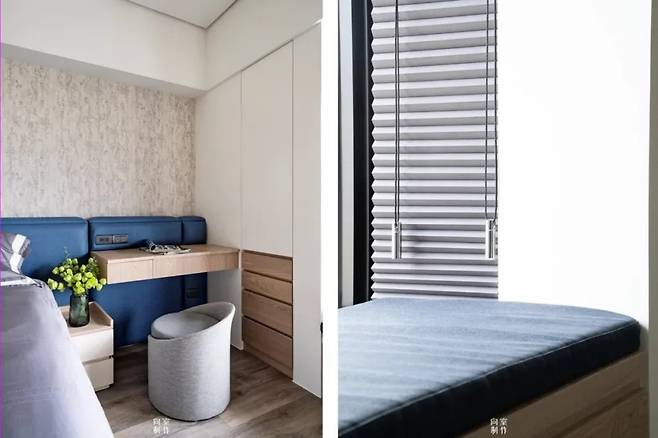 침실에 들어서면 회색 벽돌의 차분한 분위기가 스모키 오크 톤으로 부드럽게 이어져 안정감을 준다. 데님 블루 캔버스로 마감된 헤드보드는 따뜻한 벽지와 조화롭게 어우러져 감성적인 수면 공간을 제공한다.