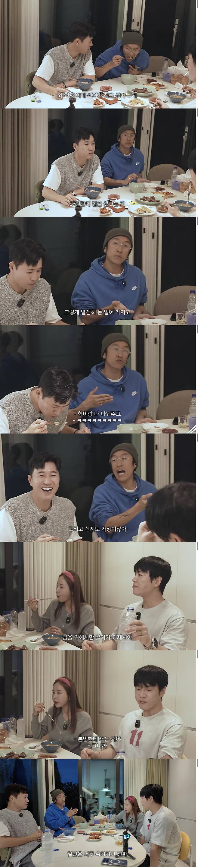 이후 네 사람은 함께 식사를 즐겼다. 빽가와 김종민은 27년 만에 처음으로 집을 산 신지를 축하했다. 빽가는 "(신지가) 그렇게 열심히 돈 벌어 형이랑 나한테도 나눠줬다. 또 부모님 집에도 계속 돈을 갖다 드렸다"며 "남을 위해만 살다가 이제서야 27년 만에 자기 집을 사다니, 말이 되냐. 진짜 신지는 이리 뜯기고 저리 뜯겼다"고 털어놓았다. 김종민 역시 "다 당하고 남은 돈으로 술 마시고 그러다가 다 쓴 거다"라며 장난스럽게 축하했다.