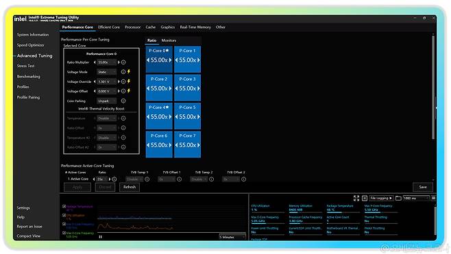 먼저, 인텔은 공식 오버클럭 및 시스템 튜닝 도구인 XTU를 통해, Windows 환경에서 손쉽게 오버클럭을 적용할 수 있습니다. CPU 성능 향상, 전력 제한 해제, 메모리 튜닝 등의 고급 설정이 가능하며, 별도의 프로그램 설치 없이 진행하려는 경우에는 BIOS에서도 간편하게 설정할 수 있죠.