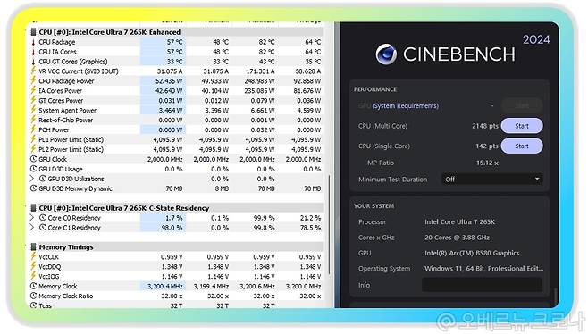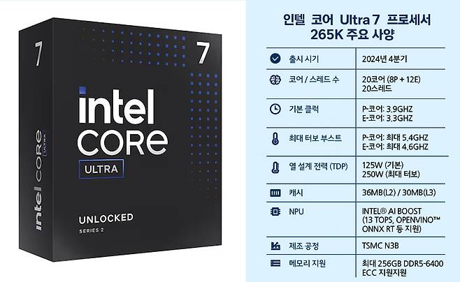 오버클럭에 앞서, 인텔 코어 울트라 265K는 최신 하이브리드 아키텍처를 적용한 고성능 프로세서로, 서로 다른 특성을 지닌 두 종류의 코어를 조합해, 성능과 전력 효율을 동시에 추구하는 것이 특징인데요. 고성능 작업에 적합한 P-코어(Performance Core)와 에너지 효율이 뛰어난 E-코어(Efficient Core)를 혼합해, 고부하 작업과 일상적인 작업을 각기 다른 코어에 효율적으로 분산 처리함으로써, 시스템 성능과 전력 소비를 균형 있게 관리할 수 있도록 설계되었습니다. 인텔 265K의 경우에는 하이퍼스레딩을 지원하지 않기 때문에, 결과적으로 8개의 P코어와 12개의 E코어로 구성된 20코어(8P+12E) 20스레드(8P+12E)로 CPU 연산 작업을 수행하는데요.