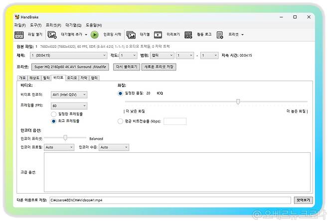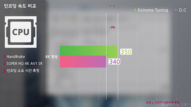 또, 벤치마크 프로그램 외의 실제 사용 프로그램에서도 어느 정도의 차이가 있을지 살펴봤는데요. 4분가량의 8K 영상 파일을 인텔 퀵싱크를 사용해 4K 해상도로 다시 인코딩을 진행했을 때, 자동 오버클럭 대비 수동 오버클럭 적용 시에 약 10초 정도 빠르게 결과물을 생성했습니다.