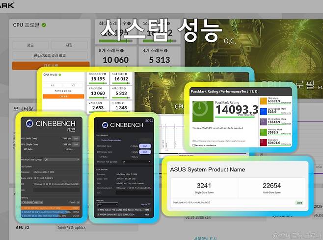 이렇게 적용한 설정값은, 모두 정상적으로 표현되는 모습을 확인할 수 있고, 특히, 전력 제한 해제 및 높은 전압으로 구동되는 자동 오버클럭에 비해, 더 낮은 전력에서 높은 퍼포먼스를 제공하는 모습을 확인할 수 있었는데요. 향상된 코어 성능을 확인하기 위해 벤치마크 프로그램을 실행해 보면, 3DMARK CPU 테스트에서 Max threads는 18,195점을 기록했고, CPU MARK에서 60,000점을 넘는 점수를 보이면서, 더욱 강력해진 CPU 성능을 확인할 수 있었습니다.