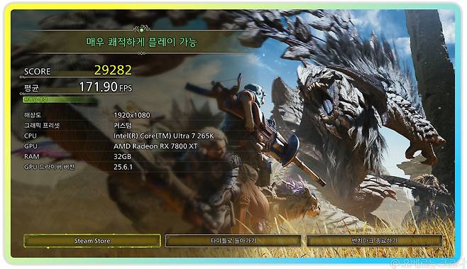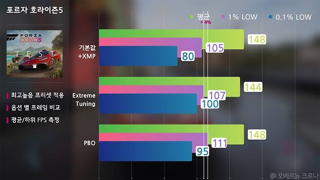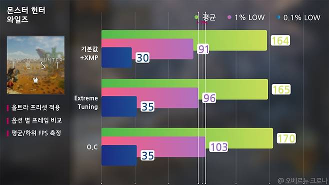마찬가지로, 게임에서는 어떠한 효과가 있을지 살펴보기 위해, 게임 몬스터헌터 와일즈와 포르자 호라이즌 5를 플레이해, 벤치마크 결과를 비교해 봤는데요. 확실히, 오버클럭 적용 시 약 1천 점(3%) 가량 높은 점수를 확인할 수 있고, 평균 프레임과 1% LOW 값 모두 더 높게 측정되면서, 일상과 고부하 작업 모두에 안정적인 성능을 기대할 수 있겠습니다.