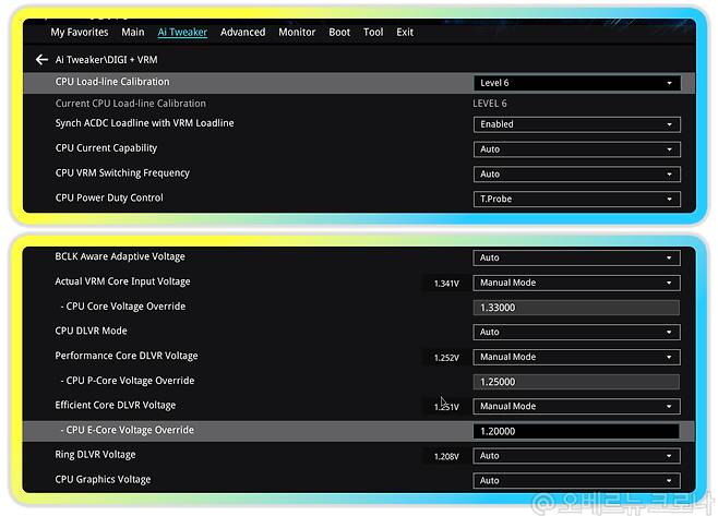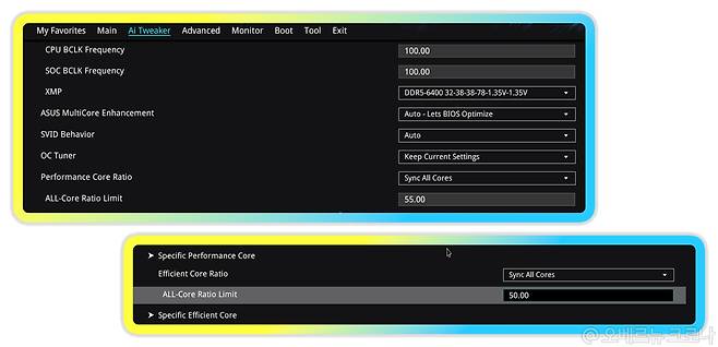 오버클럭을 위한 항목들이 모두 Ai Tweaker 탭에 위치하고 있고, 프로세서와 메모리, 전압 순으로 적용 옵션들이 나열되어 있어, 위에서 아래로 순서대로 진행해, 전반적인 오버클럭 절차가 매끄럽게 이어지는 것을 확인할 수 있었습니다. 먼저 게임과 렌더링, 대용량 연산 등 무거운 작업을 빠르게 처리할 수 있는 고성능 코어인 P코어를 최대 터보 주파수인 5.5GHz에 맞추었고, 웹서핑과 스트리밍, 백그라운드 작업 등 가벼운 멀티태스킹에 적합한 E코어 역시, 5GHz로 통일해, 모든 작업에 안정적인 성능을 제공할 수 있도록 했는데요.