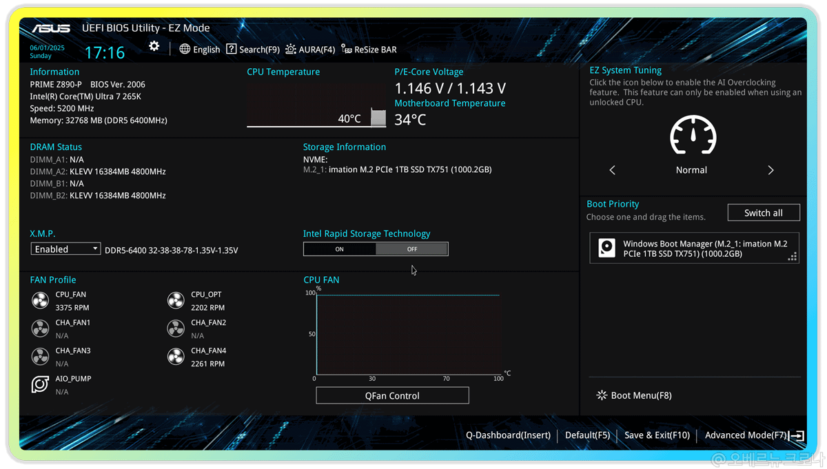 지난 시간에는, ASUS의 자동 오버클럭 기능을 통해, 시스템에 부담 없는 범위 내에서 보다 효과적으로 인텔 코어 울트라 265K를 사용하는 방법을 살펴봤는데요. ASUS 메인보드에서는 다양한 AI 기술을 제공하고 있고, 그중에서도 자동 최적화 기능인 ASUS EZ System Tuning은 ASUS의 다양한 칩셋의 메인보드에서 활용할 수 있어, 인텔 265K CPU와 같이, 잠금이 해제된 인텔 CPU를 사용하는 경우에는 Extreme Tuning로 설정해, 더욱 효과적인 성능 향상을 꾀할 수 있었습니다.