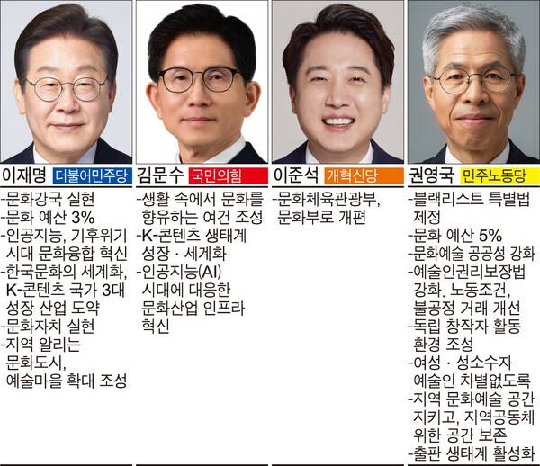 먼저 이재명 더불어민주당 후보와 김문수 국민의힘 후보는 문화를 경제 성장 수단으로 여기는 분위기가 여전하다. 지역 문화 정책 역시 대체적으로 '지원'과 '관광' 수준을 벗어나지 못하고 있다. 문화 관련 예산을 확대하겠다는 공약은 긍정적이지만, 구체성이 부족하다. 이준석 개혁신당 후보는 딱히 문화 예술 정책이라 할 만한게 보이지 않다. 그나마 권영국 민주노동당 후보가 문화예술 정책 패러다임 전환을 들고나온 게 두드러진다.