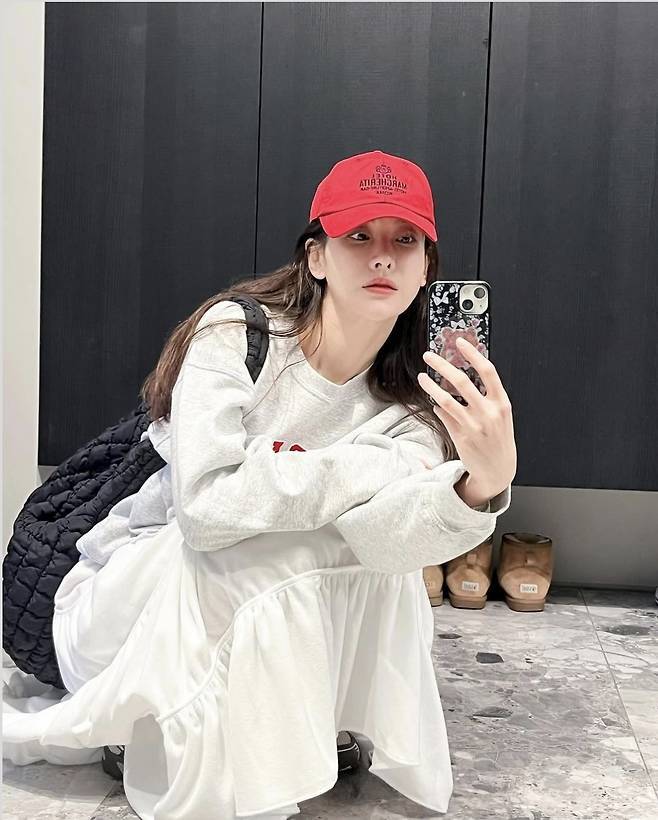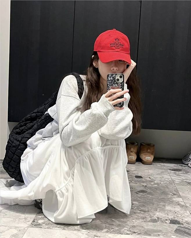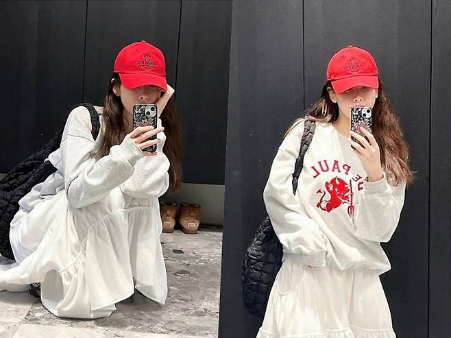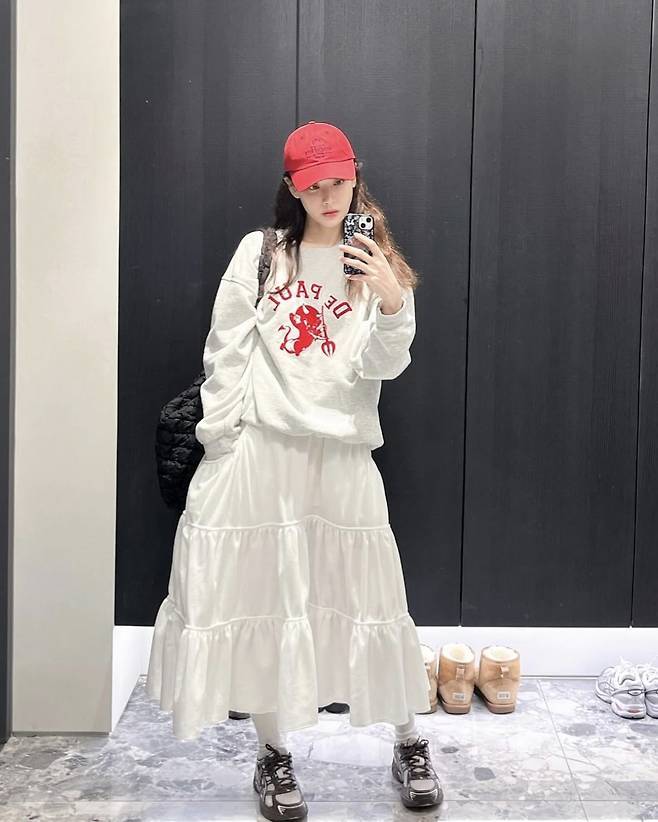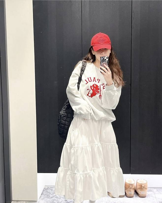 배우 오연서가 레드 볼캡과 루즈핏 스웻셔츠, 티어드 스커트를 활용해 스포티하면서도 여성스러운 감성의 데일리룩을 완성했습니다.