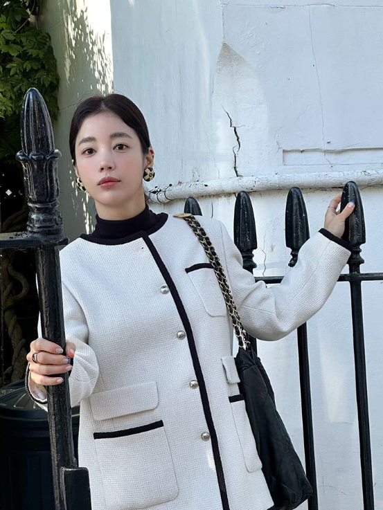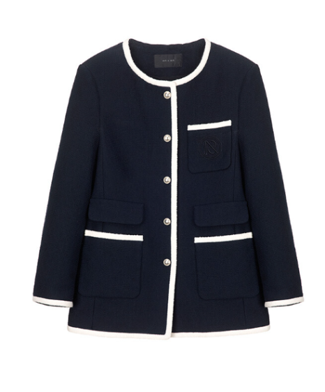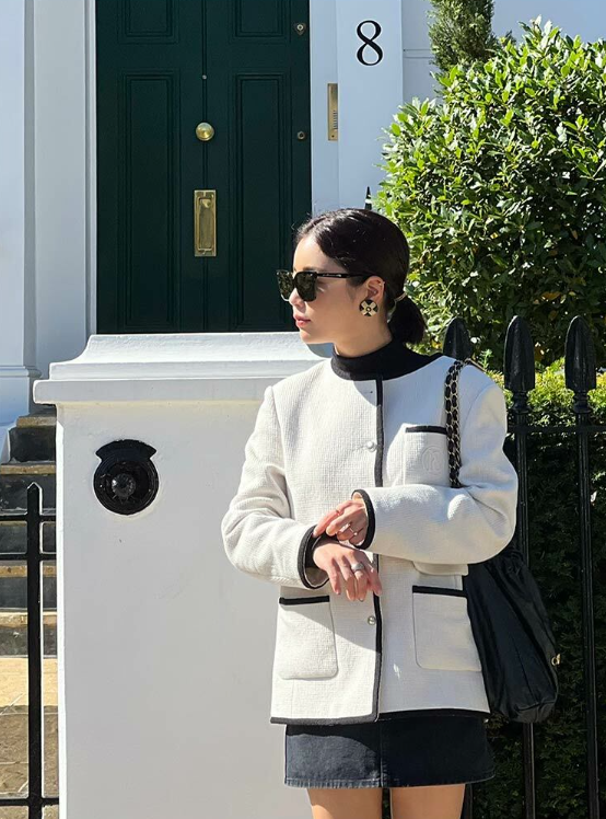 그 중심에는 단정한 라운드 넥과 배색 디테일이 돋보이는 트위드 자켓이 자리하고 있다. 깔끔한 블랙 포인트 라인, 고급스러운 금장 버튼, 그리고 군더더기 없는 실루엣까지