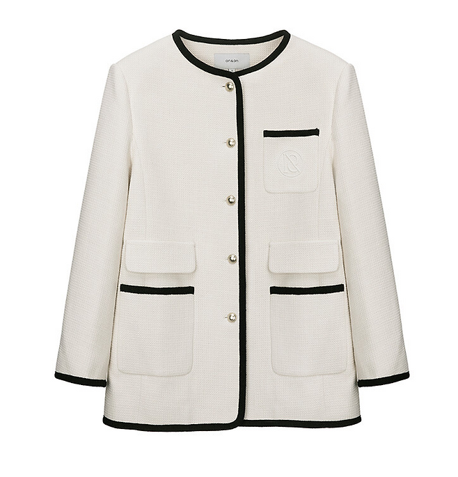이 온앤온 라운드 넥 배색 트위드 자켓은 노카라 디자인 덕분에 우아하면서도 부담 없이 걸치기 좋다. 가디건처럼 가볍게 착용할 수 있고, 블랙 배색 라인이 깔끔한 실루엣을 살려준다.