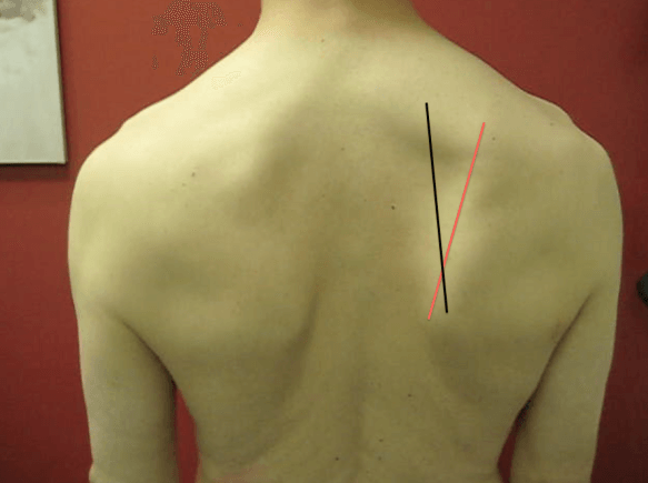 견갑골은 원래 사진의 견갑골의 안쪽선이 검은선 에 걸쳐져야하는데 사진으로 보면 안쪽으로 더 들어온것이 보이시죠?