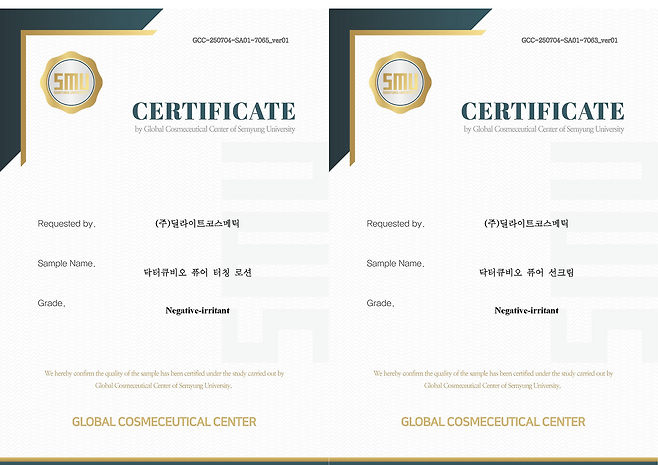 세명대 화장품임상연구지원센터에서 실시한 보습 개선 효능 평가 인체적용시험 결과 로션 사용 직후 피부 수분량이 77.24% 개선된 것으로 나타났다.