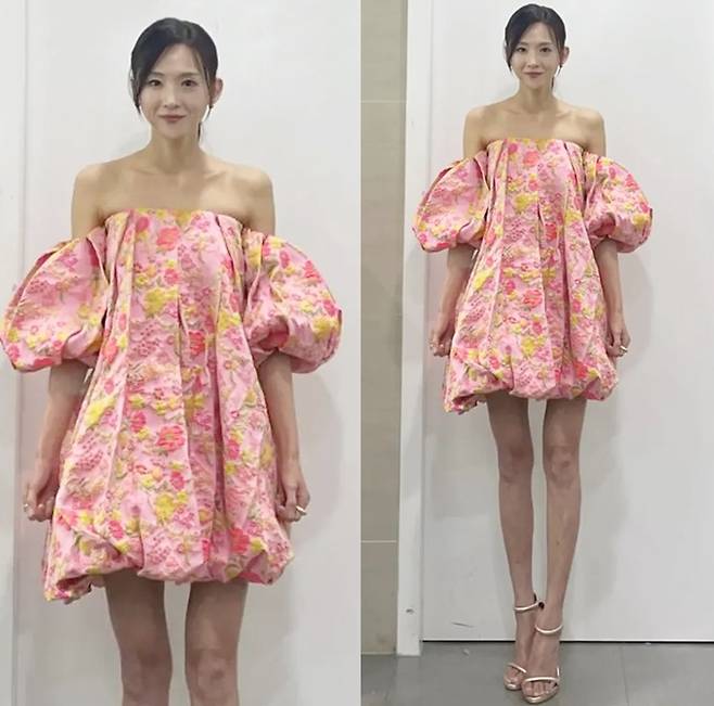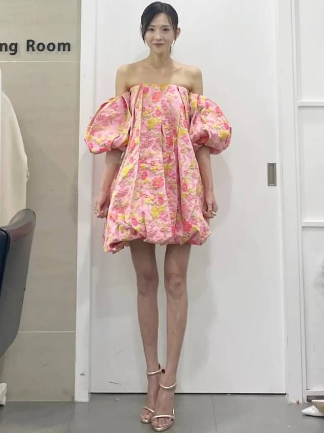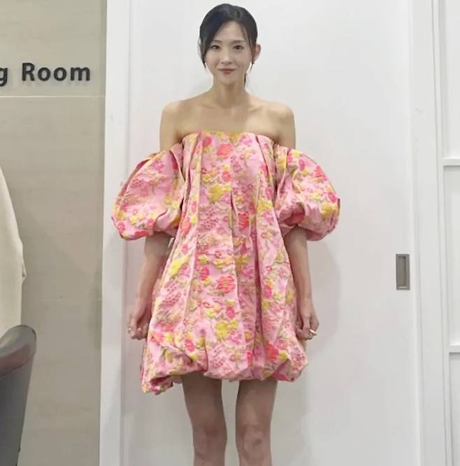 그룹 베이지복스의 이희진이 가녀린 몸매에 오프숄더 꽃무늬 벌룬 원피스룩으로 시선을 사로잡았다.