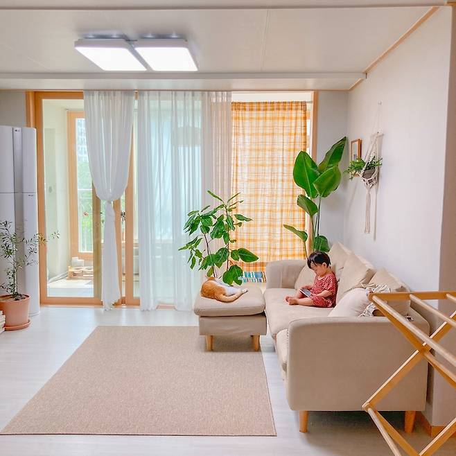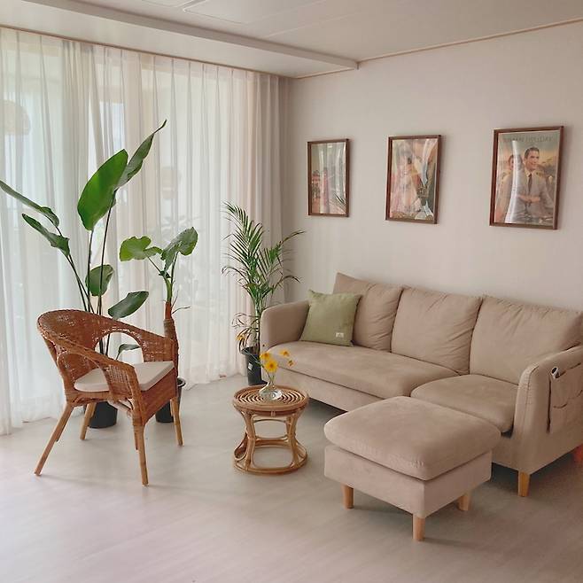 나무색 몰딩에 어울리는 내추럴 인테리어로 꾸민 거실이에요.