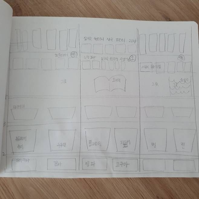먼저 저희 집 도면을 보여드릴게요. 저희 집은 27평형 15살 된 아파트입니다. 확장된 공간 없이 방마다 발코니가 딸려 있어요. 전셋집이다 보니 시공 같은 건 안 했고 감사하게도 주인분께서 도배와 장판, 조명은 새로 해주셨습니다. 주인분께서 제공해 주신 색 도화지가 있으니 그에 어울리는 물감으로 저만의 그림을 그려나갔답니다.