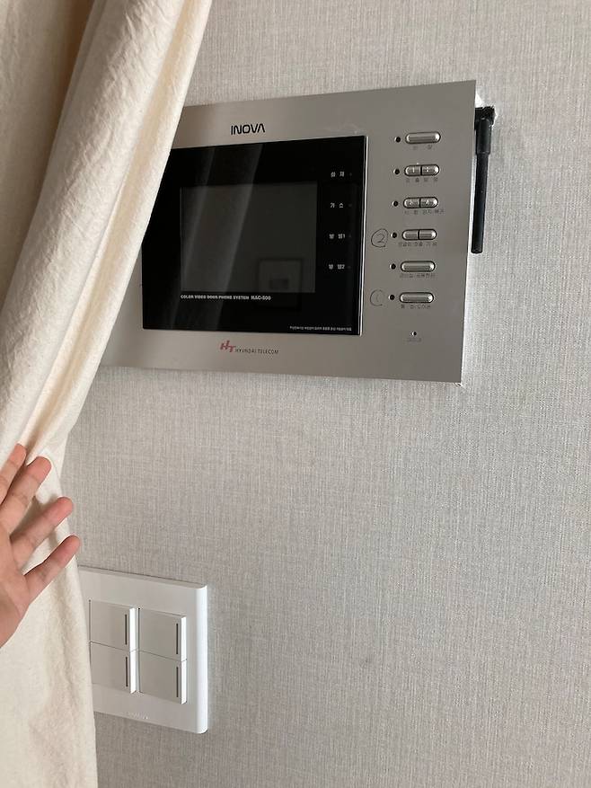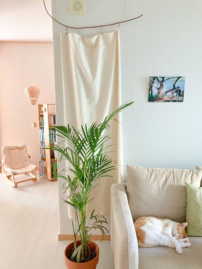 차가운 느낌의 인터폰이 저희 집 거실과는 너무 안 어울려서 가리고 싶은데 벨이 울리면 인터폰을 눌러 현관을 열어줘야 하는 시스템이라서 액자 같은 것으로 가리는 것은 무리였죠. 결국 꼭꼬핀에 나뭇가지를 매달고 커튼을 달아줌으로써 인터폰 사용도 가능하면서 인테리어도 해치지 않는 방법을 찾아냈습니다.