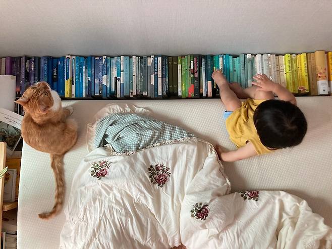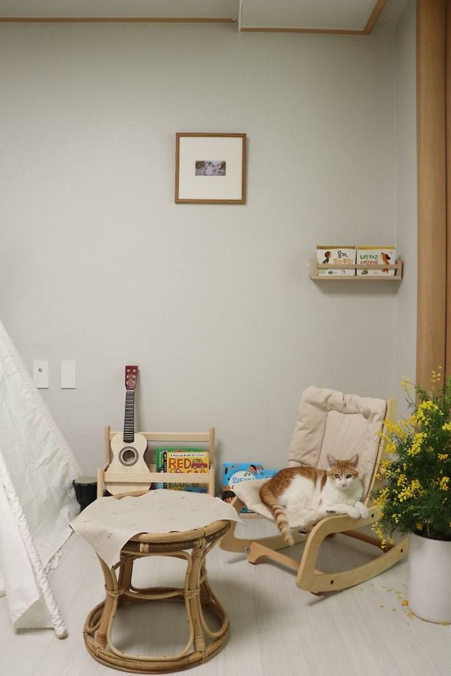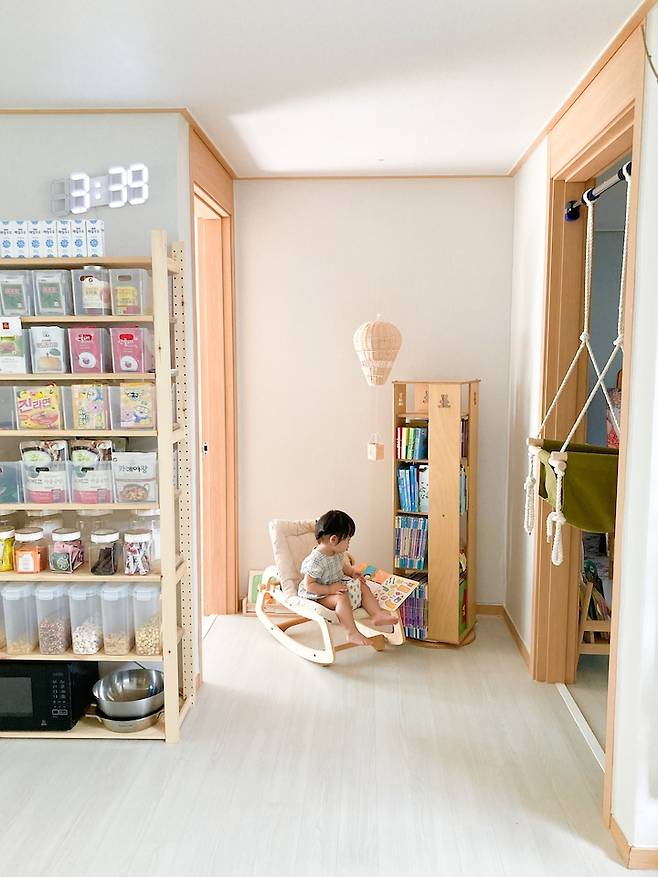 주방을 지나서 침실과 홈카페 방 사이 빈 공간에는 아기의 독서 공간을 만들어 주었어요. 티브이 없는 환경이라 그런 건지 성향인 건지 제가 동화 구연을 잘해서 그런지(하핫) 아이가 책을 정말 정말 좋아해요.