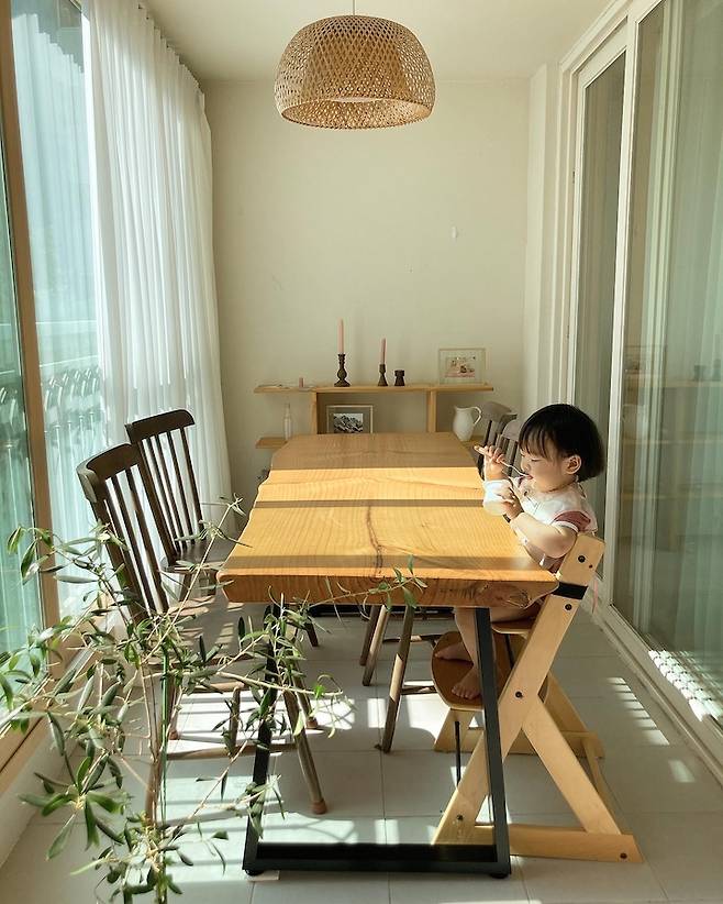침실 맞은편에 있는 홈카페 방이에요. 사람들과의 교제를 즐겨서 신혼 때부터 6인용 식탁을 두고 생활했어요. 저희가 머무는 집은 우리 가족뿐만 아니라 이웃까지도 품는 따뜻한 공간이었으면 좋겠어요. 사람들이 저희 집에 와서 삶을 나누고 생각과 마음을 나누는 이 공간이 저는 참 좋아요.