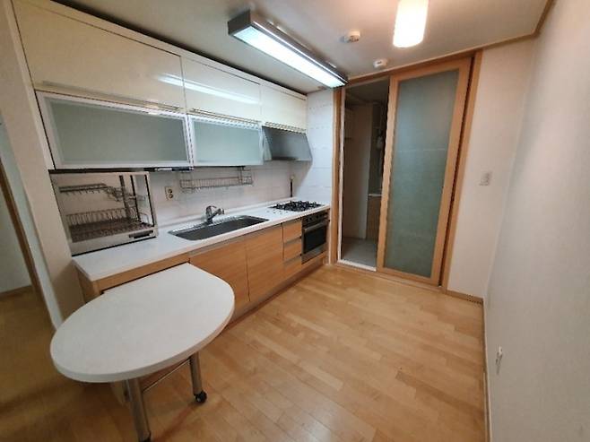 일자 주방이다 보니 동선이 짧다는 점이 참 효율적이었습니다. 냉장고는 주방에 딸린 보조 주방에 들어가 있어요.