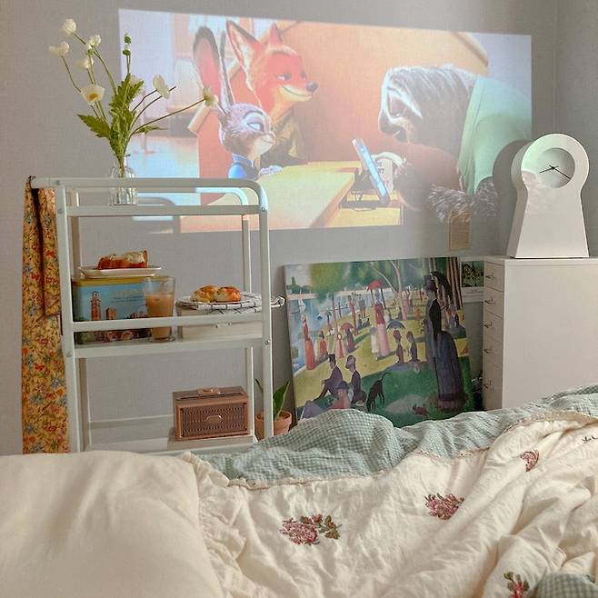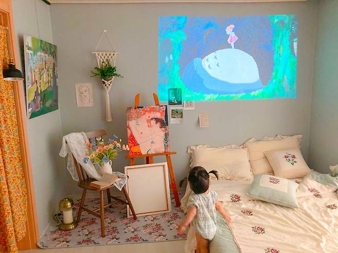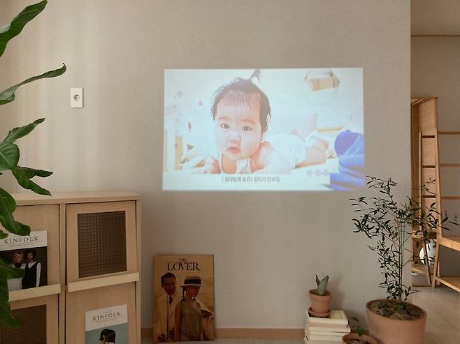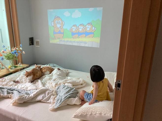 저희 집은 신혼 때부터 티브이 없이 생활했는데, 최근에는 생일선물로 받은 빔을 쏴서 영화를 보거나 제가 만든 유튜브 동영상을(육아 브이로그) 아이와 같이 보곤 한답니다.