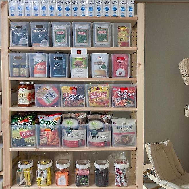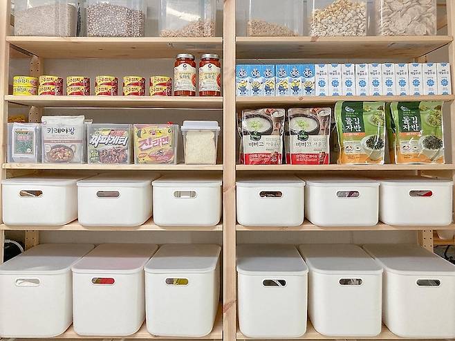 팬트리는 사용의 편리성에 따라 선반위치를 바꿔가면서 정리해주고있어요.