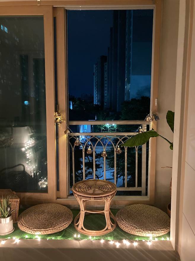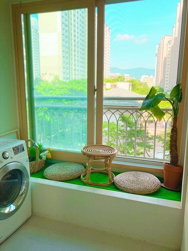 여기는 드레스룸에 딸린 작은 베란다인데 미니 홈카페로 꾸며보았어요. 여기에 앉아서 초록초록한 나무들과 놀이터에서 해맑게 뛰어노는 아이들을 보면서 소소한 힐링을 누린답니다.