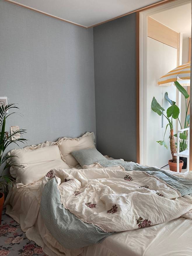 오늘의집에 사진 올렸을 때 감사하게도 많은 분들이 이쁘게 봐주셨던 침실이에요. 원래는 침실마저도 내추럴하고 심플하게 화이트 앤 원목으로 꾸미려 계획했으나 집주인분께서 블루 색상의 벽지로 도배를 해주셨기에 그에 어울리는 빈티지 느낌으로 꾸미게 된 거랍니다. 지내다 보니 이 벽지 색깔이 정말 마음에 듭니다! :)