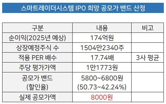 세 회사의 최근 4분기 기준 평균 PER은 17.74배이며 이를 바탕으로 스마트레이더시스템의 기업가치는 1771억원으로 평가됐다. 발행 주식 1504만2340주를 기준으로 주당 평가액은 1만1773원으로 계산됐고, 회사는 여기에 50.73~42.24%의 할인율을 적용해 공모가액 밴드를 정했다. 기관투자자 수요예측에서 성공한 것도 주당 평가액 기준 할인율이 높았던 덕분으로 보인다.