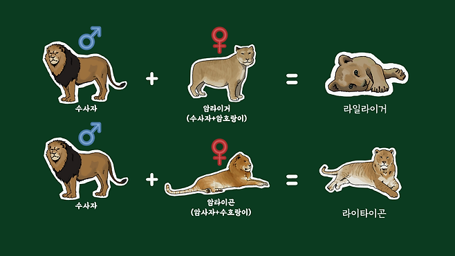 참고로 이종교배 종은 단순히 두 종의 중간 형태가 아닙니다. 그 예로 라이거(수사자+암호랑이)는 400kg이 넘지만 타이곤(암사자+수호랑이)은 200kg이 채 되지 않습니다.