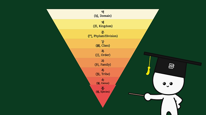 현대의 생물 분류 체계는 역(域, Domain)-계(界, Kingdom)-문(門, Phylum/Division)-강(綱, Class)-목(目, Order)-과(科, Family)-족(族, Tribe)-속(屬, Genus)-종(種, Species)으로 이루어지고, 종은 가장 기본적인 생물 분류입니다.