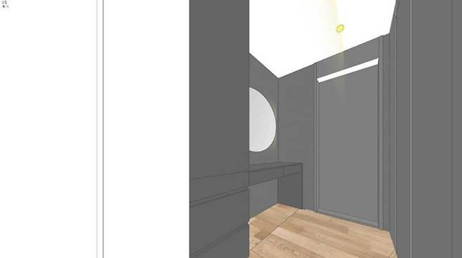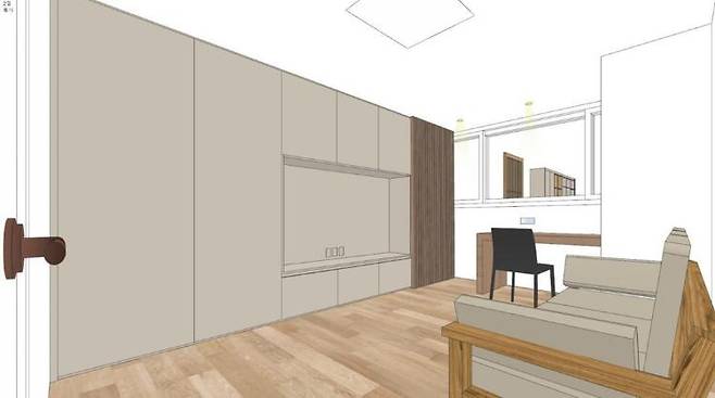 그래서 창고로 가는 문은 슬라이딩 도어로 가리고 책과 학용품 등을 수납하고 TV를 두는 월 플렉스를 디자인해 보았지요.