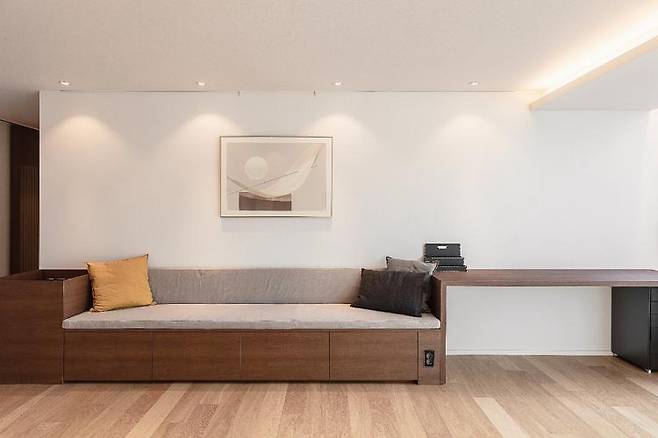 그리고 저도 혼자 방에 앉아 있으면 공부가 잘 안되고 카페에서 작업을 많이 하는데 아이들이 자연스럽게 공부할 수 있는 스터디 카페 같은 분위기를 만들고 싶었어요. 아이들이 그래서 거실에서 아이들이 편안하게 책도 읽고 공부도 하고 쉴 수 있는 넓은 벤치형 소파와 책상을 직접 디자인해 보았습니다.