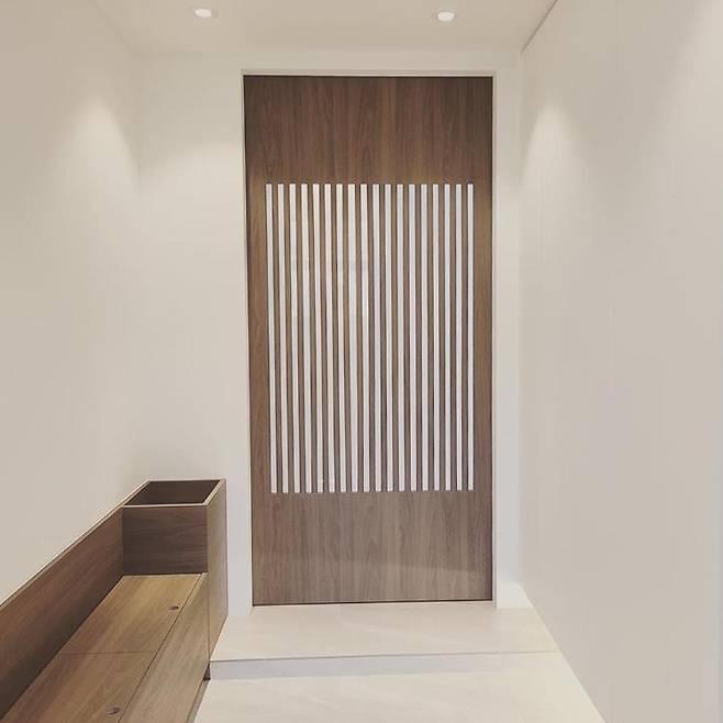 잡동사니를 보관하고 편안히 신발을 신을 수 있는 벤치장과 차키 등바로 챙겨나갈 물건들을 수납할 테이블을 마련하고 포스 있는 중문으로 분위기를 잡은 현관
