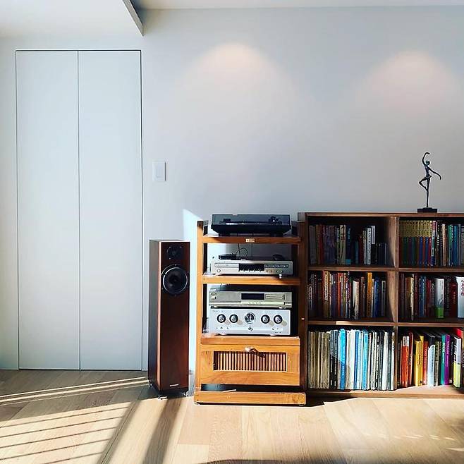 반대쪽은 낮은 책장과 오디오로 편안한 느낌을 주고 베란다로 가는 문은 터치 도어로 가렸습니다.