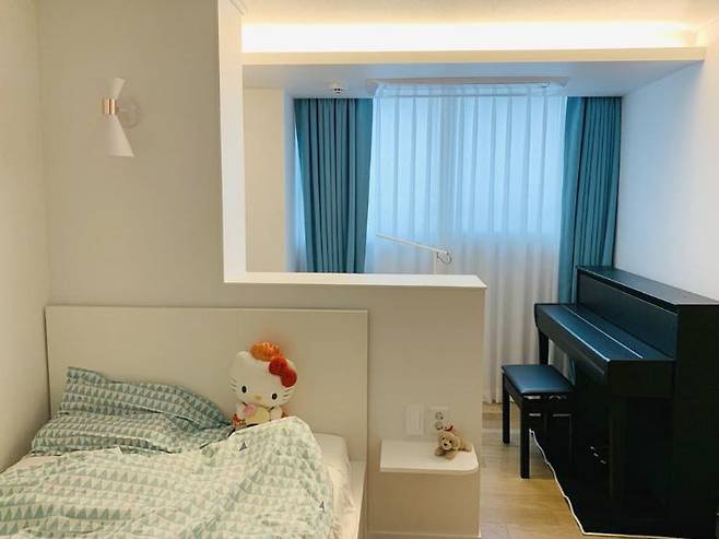 남아있는 내력벽을 가벽으로 연장해서 공간을 나누고 (가벽 반대쪽에는 책장과 책상이 있습니다) 조명과 무지주 선반, 침대 시트와 커튼으로 아늑한 분위기를 연출한 아이방