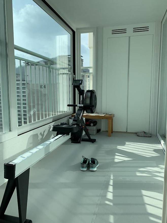 베란다엔 체육관용 매트를 깔고 로잉머신을 구입해서 나만의 홈짐으로 꾸몄어요.