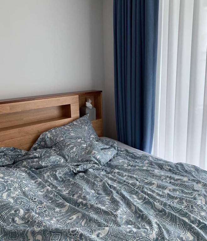 확장을 하지 않아 가장 작은 안방은 깔 맞춤한 이불 커버와 커튼으로 깔끔하게 꾸몄습니다.