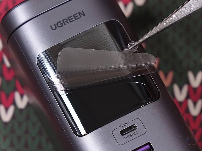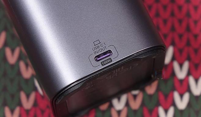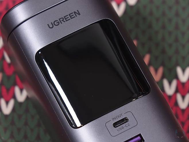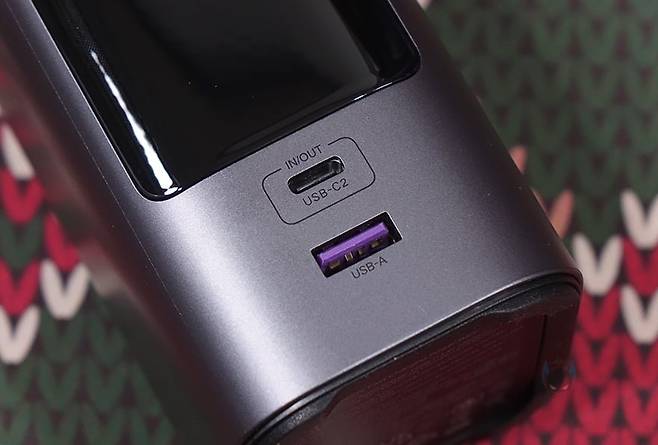 그리고, 전면에는 130W, 200W 모델과 마찬가지로 스마트 디지털 디스플레이가 적용되어 있는데, 개봉시에는 보호비닐이 부착되어 있으며, 뒤에서 확인하겠지만, 입/출력의 충전속도와 전압 상태를 실시간 모니터링 할 수 있습니다. 또한, 디스플레이 아래에는 전면 포트로 USB Type-C 포트와 Type-A 포트가 각각 배치되어 있는데, Type-C 포트는 2번 포트로 입/출력 모두 지원하며, Type-A 포트는 출력 지원만 합니다. 참고로, Type-C 포트는 입/출력 모두 최대 45W, Type-A 포트는 출력 최대 22.5W를 지원하죠.