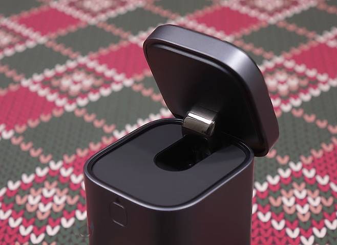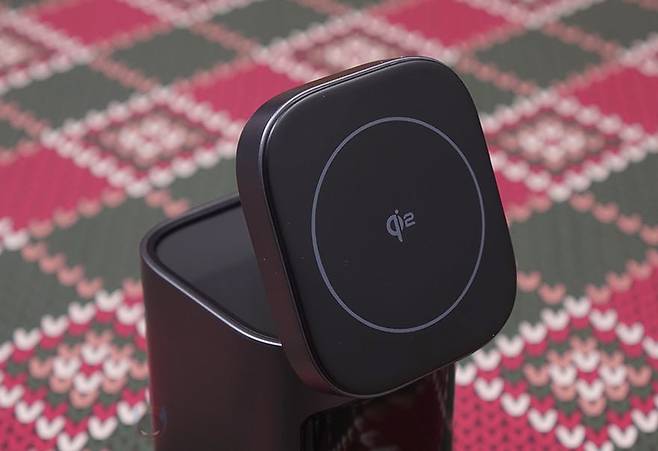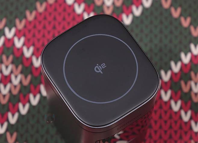 제품 상단에는 이 제품의 주요 특징 중 하나인 무선 충전 접이식 거치대가 적용되어 있는데, 앞서 언급했듯이 최신 무선 충전 규격인 Qi2 인증을 받았습니다. 그래서, 거치대 표면에도 Qi2 로고를 표기해 놨죠. 또한, 기본 무선충전 베이스는 애플의 맥세이프(Magsafe) 즉 마그네틱 방식을 적용하고 있으며, 접이식이라 거치대를 세워서 사용할 수도 있습니다. 물론, 애플 제품이 아니라도 Qi, Qi2 무선 충전을 지원하는 제품들은 모두 호환이 됩니다. 그리고, 거치대를 세웠을 때 각도는 65˚입니다.
