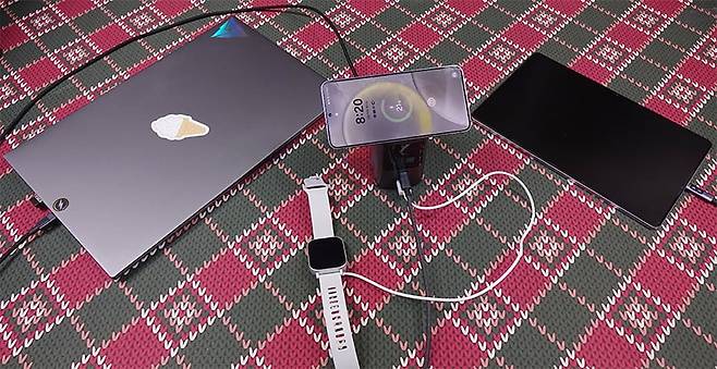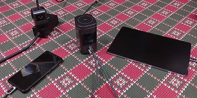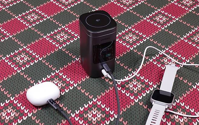 Nexode 145W 20000mAh 파워뱅크를 사용해 충전 지원을 확인해보면, 먼저 유선 충전방식으로 3개의 포트 모두 외부 기기 충전으로 사용하면 스마트 디지털 디스플레이를 통해 3개의 포트가 출력상태임을 보여줍니다. 여기서 전원버튼을 한 번 누르면 전압 출력상태를 보여주고, 30초 이상 버튼을 누르고 있지 않으면 자동으로 스마트 디지털 디스플레이 화면을 대기화면으로 전환해 로봇 디자인 이모티콘으로 보여주죠. 물론, 화면에 포트 작동상태는 외부 기기를 충전할 때만 작동해서 보여줍니다. 그리고, 이번에는 1개를 Nexode 145W 20000mAh 파워뱅크 충전용 입력으로 사용하고, 나머지 2개의 포트를 외부 기기 충전용으로 사용하면, 역시 스마트 디지털 디스플레이에서 작동에 맞게 실시간으로 보여주는데, 입력시에는 녹색 그래프로 보여줍니다. 또한, 30초 이상 전원버튼을 누르지 않으면, 자동으로 대기 화면으로 전환해 주는데, 이때는 Nexode 145W 20000mAh 파워뱅크를 충전하는 화면으로 보여줍니다. 또한, 스마트워치 및 밴드, 무선 이어폰 같은 웨어러블 장치를 충전할때는 앞서 언급한 저전력 모드로 전환해서 충전하면 되는데, 이때는 Nexode 145W 20000mAh 파워뱅크를 충전(입력)하면 안됩니다. 저전력 모드가 해제되기 때문이죠.