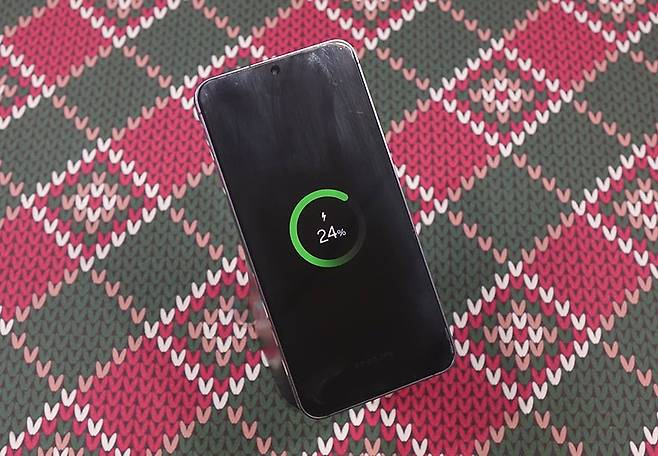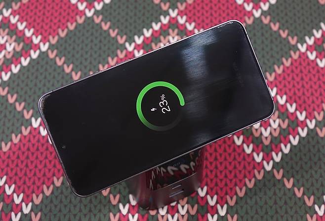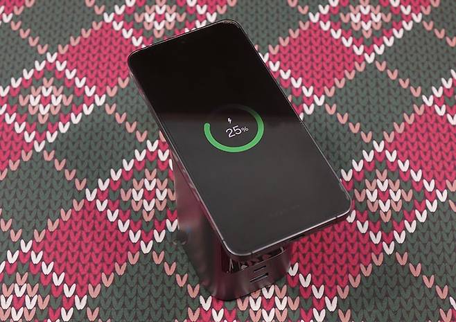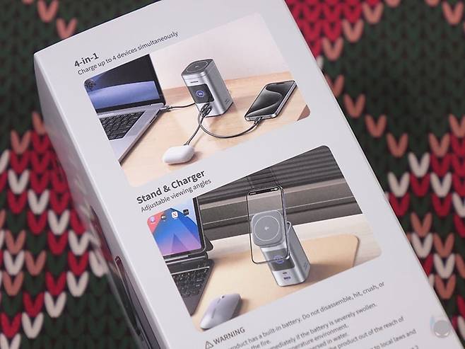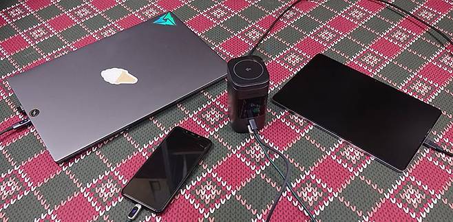 이번엔 Nexode 145W 20000mAh 파워뱅크의 주요 기능 중 하나인 무선 충전에 대해서 확인을 해보는데, 앞서 언급했듯이 Qi2 인증을 받은 제품으로 Qi2 무선 충전을 지원하는 외부 기기를 사용했을 시 최대 15W까지 충전을 지원합니다. 물론, Qi2 이하 그러니깐 이전 Qi 규격도 그대로 모두 호환이 되기 때문에, Qi 무선충전을 지원하는 외부 기기를 올려놓으면 그대로 충전이 진행됩니다. 다만, 조금 아쉬운 부분이라면, 무선 충전 시에는 스마트 디지털 디스플레이에 따로 표시를 안 해줍니다. 그래서, 무선 충전하는 외부 기기에서 LED 인디케이터나 스마트폰 무선 충전이라면 스마트폰 화면을 통해 충전 상태를 확인할 수 있죠. 그리고, 애플 맥세이프를 베이스로 하기 때문에 마그네틱 방식을 적용하고 있어서, 아이폰 같은 스마트폰 자체의 마그네틱 또는 케이스를 사용한 마그네틱 방식을 사용해서 충전할때는 거치대를 세워서 사용하면 스마트폰 화면뷰를 보면서 충전할 수 있습니다. 또한, 앞서 만난 130W, 200W 모델은 포트로만 충전 지원을 하기때문에 최대 충전할 수 있는 기기가 3대였다면, Nexode 145W 20000mAh 파워뱅크는 무선이 추가되어서 최대 4대까지 동시 충전이 가능합니다.