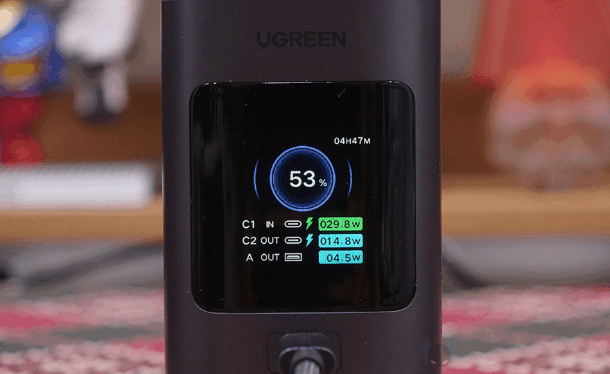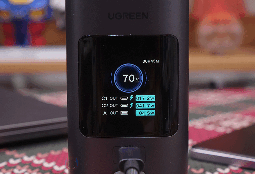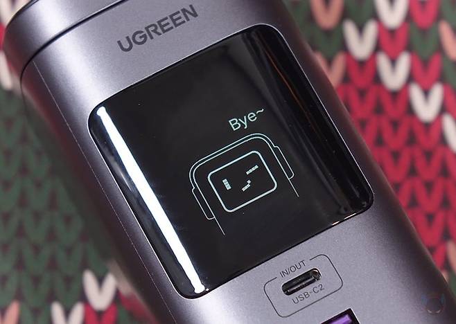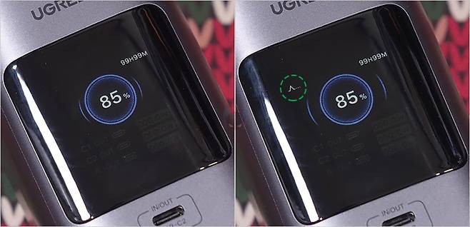 직접, 유그린(UGREEN) Nexode 145W 20000mAh 파워뱅크를 사용해보면, 후면에 배치된 전원 버튼을 누르면 바로 전면에 스마트 디지털 디스플레이에 화면이 켜지면서 기본 화면으로 배터리 잔량을 확인할 수 있습니다. 물론, 앞서 만났던 130W, 200W 모델과 마찬가지로 전원이 들어올 때 로봇 디자인의 이모티콘 확인이 먼저 나오고, 전원 버튼 사용법도 동일합니다. 전원을 켠 상태에서 버튼을 3초 이상 누르고 있으면 저전력 모드 전환으로 배터리잔량 숫자표기 왼쪽 위에 ^... 모드 표시를 해줍니다. 그리고, 전원 버튼을 6초 이상 누르고 있으면 전원이 꺼지는데, 이때도 로봇 디자인의 이모티콘이 나오죠.