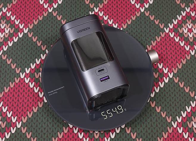 그럼, 본격적으로 유그린(UGREEN) Nexode 145W 20000mAh 파워뱅크를 살펴보면, 디자인은 스탠드형으로 앞서 만났던 Nexode의 130W, 200W 모델과는 완전히 다르고, 크기 정확히는 길이도 좀 더 짧습니다. 앞서 언급했듯이 130W와 200W 모델이 유선 충전 방식이었다면, 이번 모델은 무선 충전이 추가되었기때문에 디자인에서부터 차별화를 두고 있습니다. 무게는 약 555g으로 130W 모델보다는 약 73g 정도 무겁고, 200W 모델보다는 약 40g 정도 가볍죠. 무게감이 있지만, 휴대성에는 전혀 부담이 없습니다.
