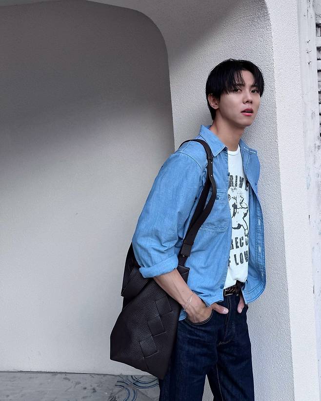 이번 스타일링의 핵심은 심플하면서도 디테일이 살아 있는 조합이다. 연청 데님 셔츠를 아우터처럼 걸치고, 안에는 화이트 그래픽 티셔츠를 매치해 캐주얼한 무드를 연출했다. 여기에 짙은 생지 데님 팬츠를 매치해 톤온톤이지만 확실히 대비되는 룩을 완성했고, 손목에 가볍게 감싼 실버 브레이슬릿과 블랙 레더 토트백이 전체 코디에 남성미와 세련미를 더했다. 팬들은 “그냥 서 있기만 해도 화보 같다”, “셔츠핏 미쳤다” 등의 반응을 보이며 뜨거운 호응을 보냈다.
