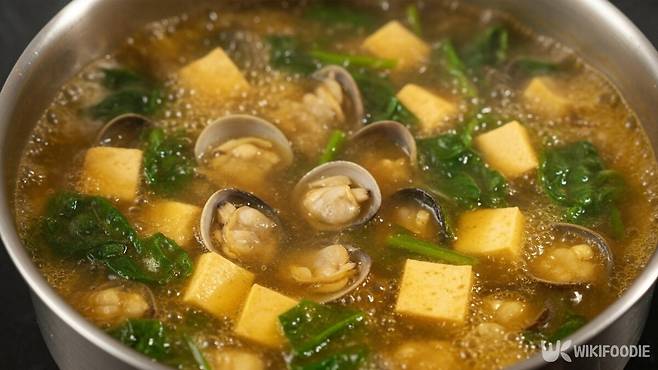 재첩은 해감한 뒤 껍질째 끓여 맑고 깊은 국물을 우려낸다. 시금치는 뿌리를 잘라내고 시든 잎을 골라낸 뒤 깨끗이 씻어 4~5cm 길이로 썬다. 양파는 채 썰고, 애호박은 반달 모양으로, 두부는 한입 크기로 잘라 준비한다.